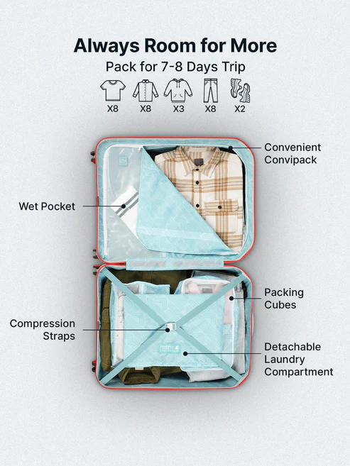 Introducing the all-new Delta Hardsided Trolley Bag, designed for modern, style-conscious travelers. Featuring a unique shape and stylish sustainable print, this unisex trolley offers both elegance and functionality. It痴 equipped with 8 smooth spinner wheels for effortless mobility, a TSA-approved lock with anti-theft zippers for enhanced security, and a detachable laundry compartment to keep your clothes organized on the go. The trolley includes a Convi Pack on one side, complete with a zippered lining pocket and transparent PVC pocket for neatly separating essentials. To make packing smarter and hassle-free, it also comes with packing cubes for better space management and organization. Perfect for business, leisure, or family travel, Delta ensures convenience and style at every step. Backed by a 2000 days warranty, this travel companion promises long-lasting performance and peace of mind. Upgrade your travel experience with Delta here smart design meets dependable quality.