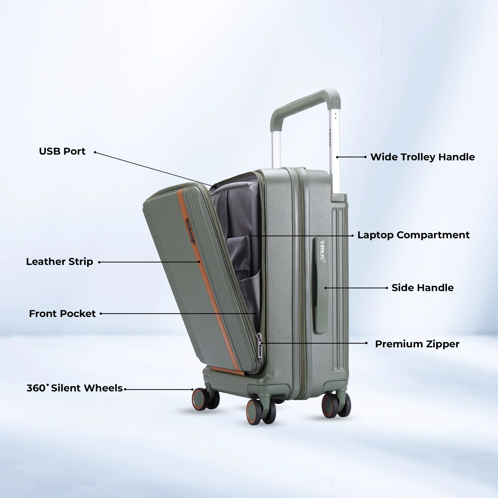From smooth gliding 8 silent spinner wheels to its sleek leather-accented design, the Timus Starlite delivers a seamless blend of performance and personality. This is not just a suitcase—it’s your statement in motion.