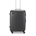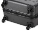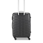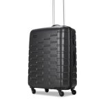 One handle on the top and one on the side, has a trolley with retractable handle on the top and four corner-mounted 360-degree rotatable skate wheels